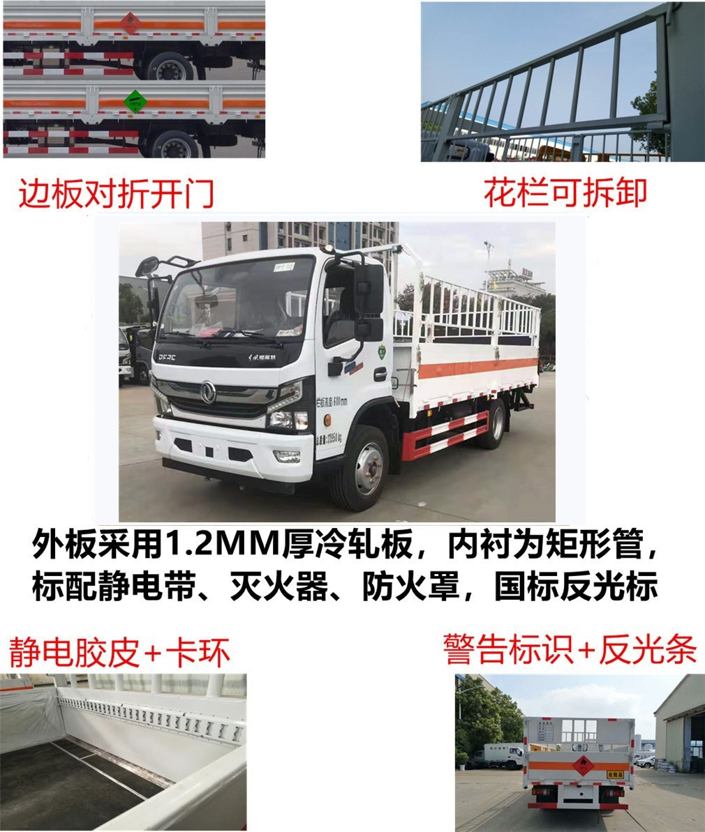 1、該車用于危險品運輸.該車運輸具有獨立容器(瓶)包裝的易燃氣體:GB 12268-2012《危險貨物品名表》第2.1項的液化石油氣,壓縮天然氣,乙炔,乙烷,丙烷,丁烷,氬氣,異丁烷,丁烯,甲烷,丙烯,環丁烷,丙二烯,二甲醚,甲乙醚,打火機或打火機加油器(裝有易燃氣體),氫;2.2項中的壓縮氧氣,壓縮氮氣,二氧化碳氣瓶,危險品標志牌選掛2.1類易燃氣體警示牌或掛2.2類非易燃無毒氣體警示牌。2、隨底盤選裝前面罩,前保險杠,前組合燈具及前霧燈,選裝液壓尾板時收起狀態的水平長度為290mm,尾板質量為420kg,選裝液壓尾板后防護焊接連接,截面尺寸100×50mm,下邊緣離地高460mm。3、側/后防護材料為Q235,側/后防護采用焊接,截面尺寸100×50mm,下邊緣離地高470mm。4、僅采用裝配前輪盤式制動器,前置排氣管,子午線輪胎,限速裝置的底盤;限速80km/h;該車安裝具有衛星定位功能的行駛記錄儀;ABS廠家及型號:襄陽東風隆誠機械有限責任公司/ABS/ASR-24V-4S/4M.4。轉向輪安裝輪胎爆胎應急防護裝置.選裝不同箱體外形. |