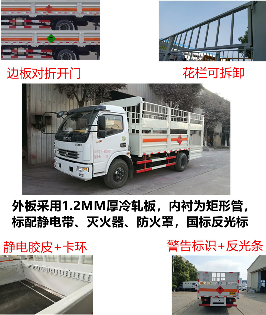 該車(chē)為危險(xiǎn)品運(yùn)輸車(chē).廂體頂部封閉,不可開(kāi)啟.該車(chē)用于運(yùn)輸具有獨(dú)立容器(瓶)包裝的物品,類項(xiàng)號(hào):2.1,2.2.隨底盤(pán)選裝駕駛室.選掛2.1類易燃?xì)怏w警示牌或2.2類非易燃無(wú)毒氣體警示牌.選裝側(cè)開(kāi)門(mén)型式及位置,選裝不開(kāi)側(cè)門(mén),廂體選裝開(kāi)百葉窗,選裝后部樣式.液壓尾板收起水平長(zhǎng)度:280mm,尾板質(zhì)量為350kg,后部安裝液壓尾板時(shí)側(cè)、后防護(hù)材料為Q235,側(cè)防護(hù)焊接連接,后防護(hù)螺栓加焊接連接,后防護(hù)截面高100mm,截面寬50mm,下邊緣離地高460mm;選裝后部不帶尾板時(shí)后防護(hù)材料:Q235,連接方式為焊接,后防護(hù)截面高100mm,截面寬50mm,下邊緣離地高460mm.僅采用排氣管前置,子午胎,限速裝置,輔助制動(dòng)裝置和前輪盤(pán)式制動(dòng)器的底盤(pán);限速80km/h. |