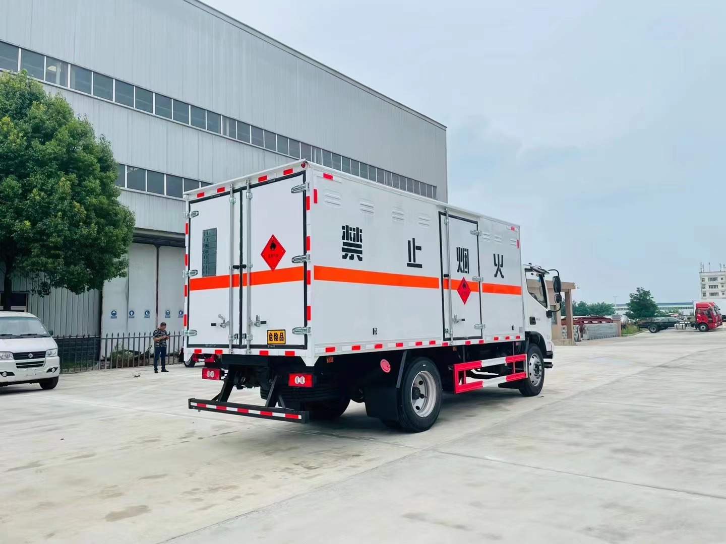 1,復合板工藝:嚴格按照公告尺寸制作。外板采用優質烤漆板(顏色可選:白,灰,檸檬黃)帶百葉窗,內飾為導電性能良好的鋁平板有透氣孔,矩形骨架結構內部填充防火阻燃材料,復合加鉚合工藝。廂體四周鋁合金包邊及包角,車廂底板鋪設防靜電膠皮,廂體前臉50公分高鋪設防靜電膠皮。后部設置對開門,右側單開門,廂體內部兩側安裝捆綁貨物的臥環。廂體內部安裝煙霧報**器,門上安裝防盜報**器。車廂一周粘貼橙色反光帶,箱體粘貼菱形標志牌,安全告示牌,危險品牌,箱體安裝示廓燈(前白后紅),拖地靜電帶。