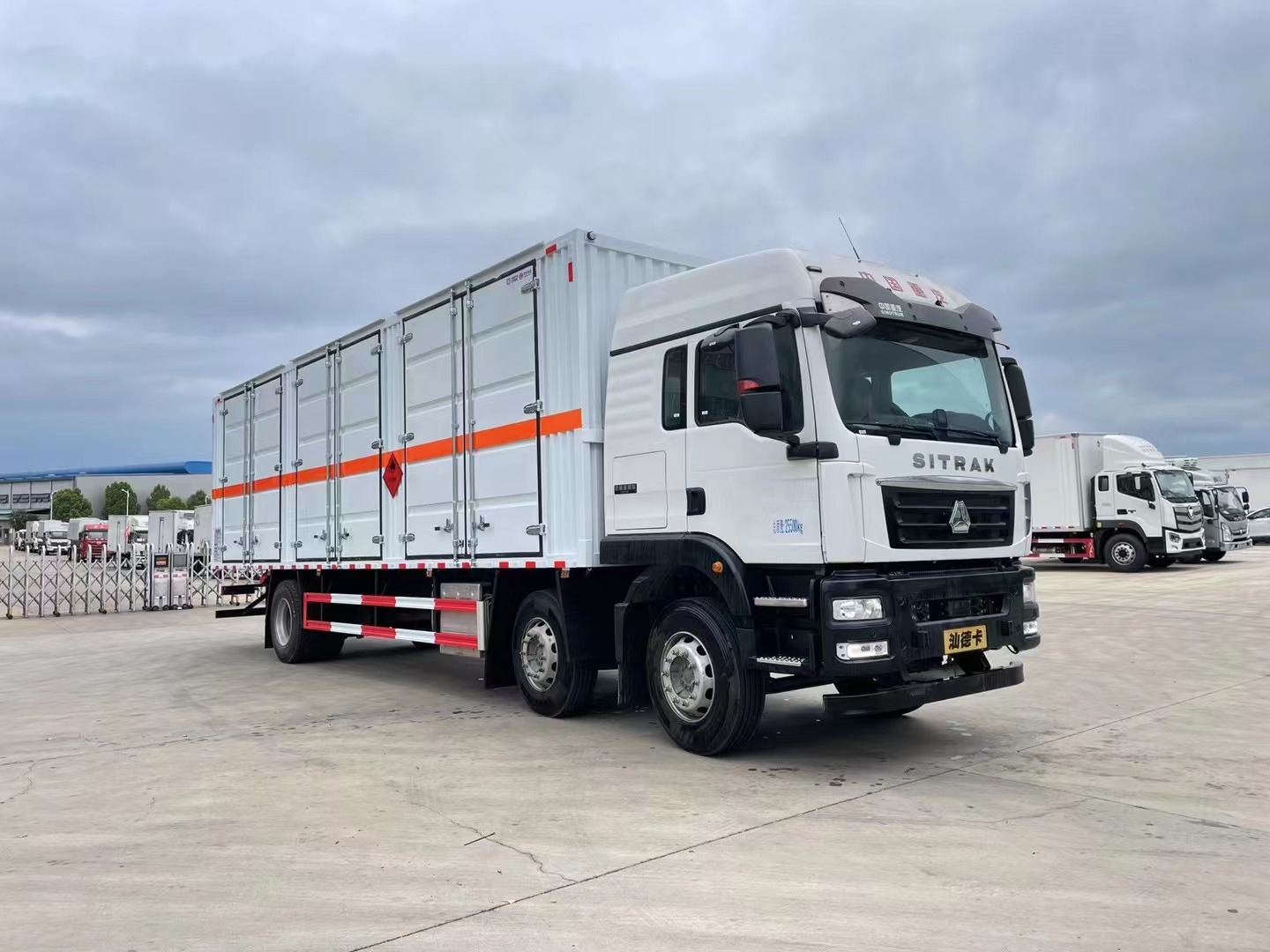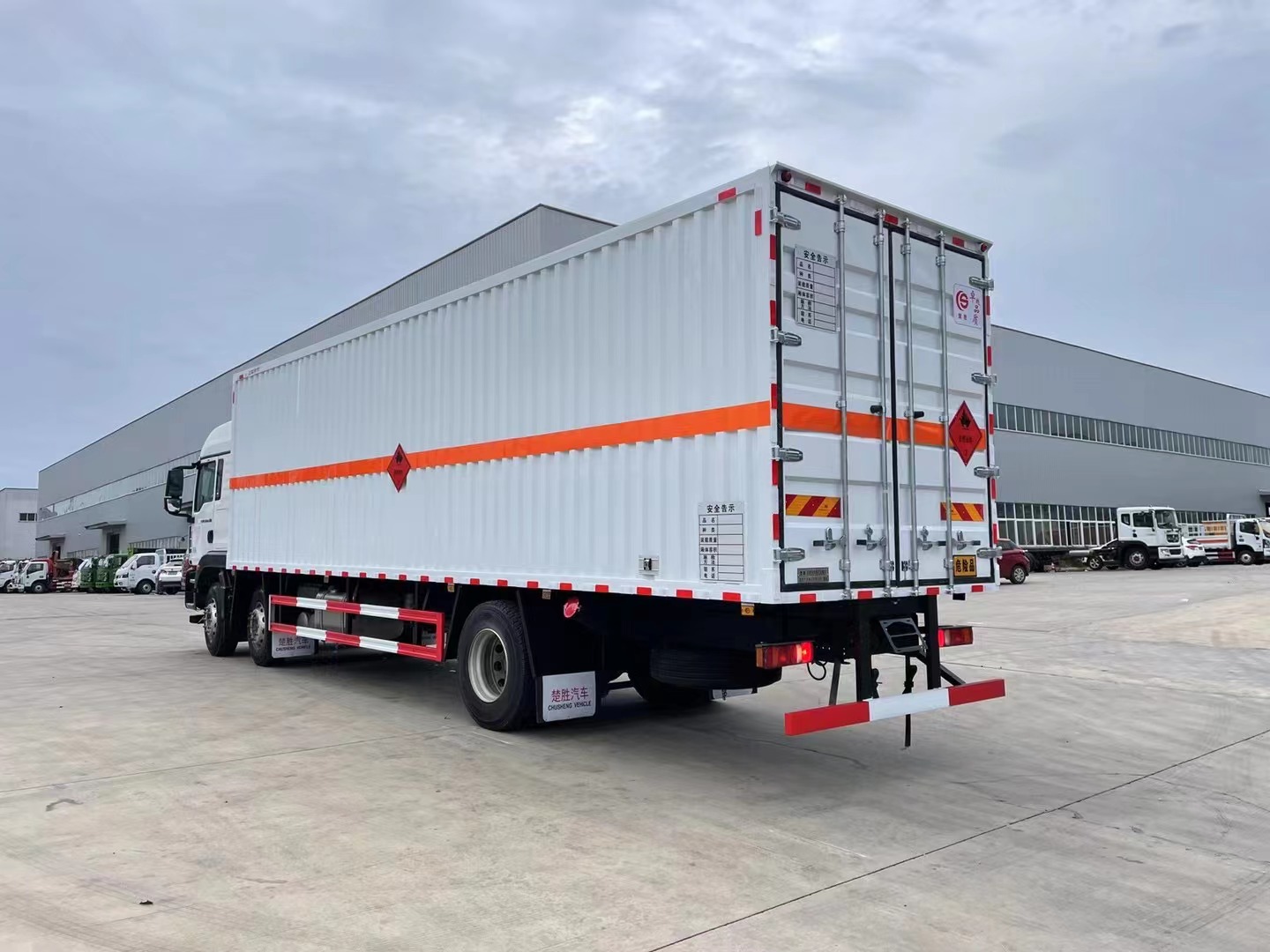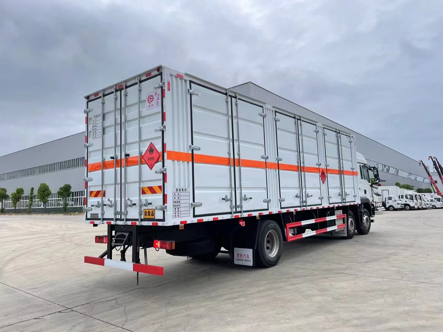 嚴格按照公告尺寸制作。外板采用烤漆板帶百葉窗,內飾為導電性能良好的鋁平板有透氣孔,矩形骨架結構內部填充防火阻燃材料,復合加鉚合工藝。廂體四周鋁合金包邊及包角,車廂底板3mm鋪設防靜電膠皮,廂體前臉50公分高鋪設防靜電膠皮。后部設置對開門,右側單開門,廂體內部兩側安裝捆綁貨物的臥環。廂體內部安裝煙霧報**器及防盜報**感應器。車廂一周粘貼橙色反光帶,箱體粘貼 菱形標志牌,安全告示牌,危險品牌,箱體安裝示廓燈(前白后紅),拖地靜電帶。