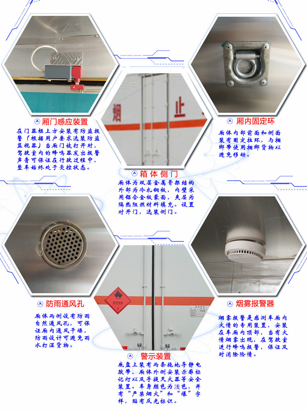 柳汽乘龍前四后八腐蝕品廂式運輸車是運輸具有獨立容器(瓶)包裝介質的運輸車。該車主要運輸的介質包括:氨溶液(氨水)、甲醛溶液、除銹磷化液(除銹磷化處理劑)、電池、電池液、木餾油等物質,類項號:8類危險品。