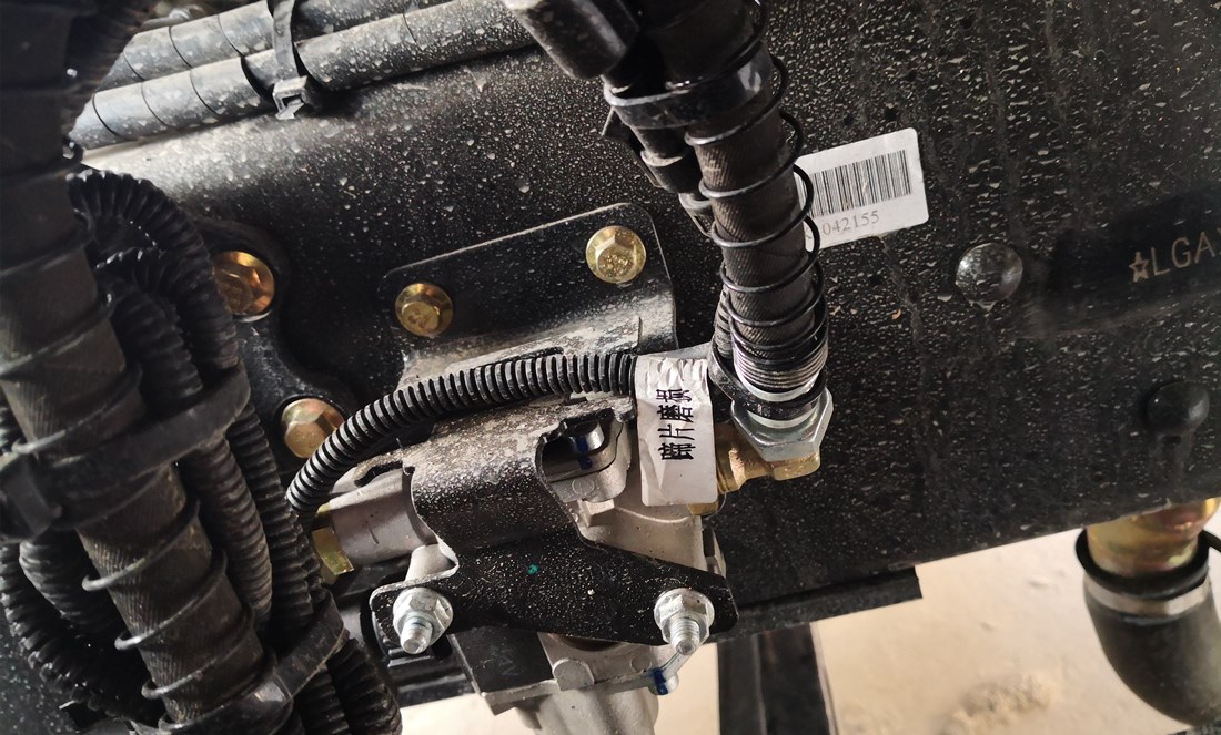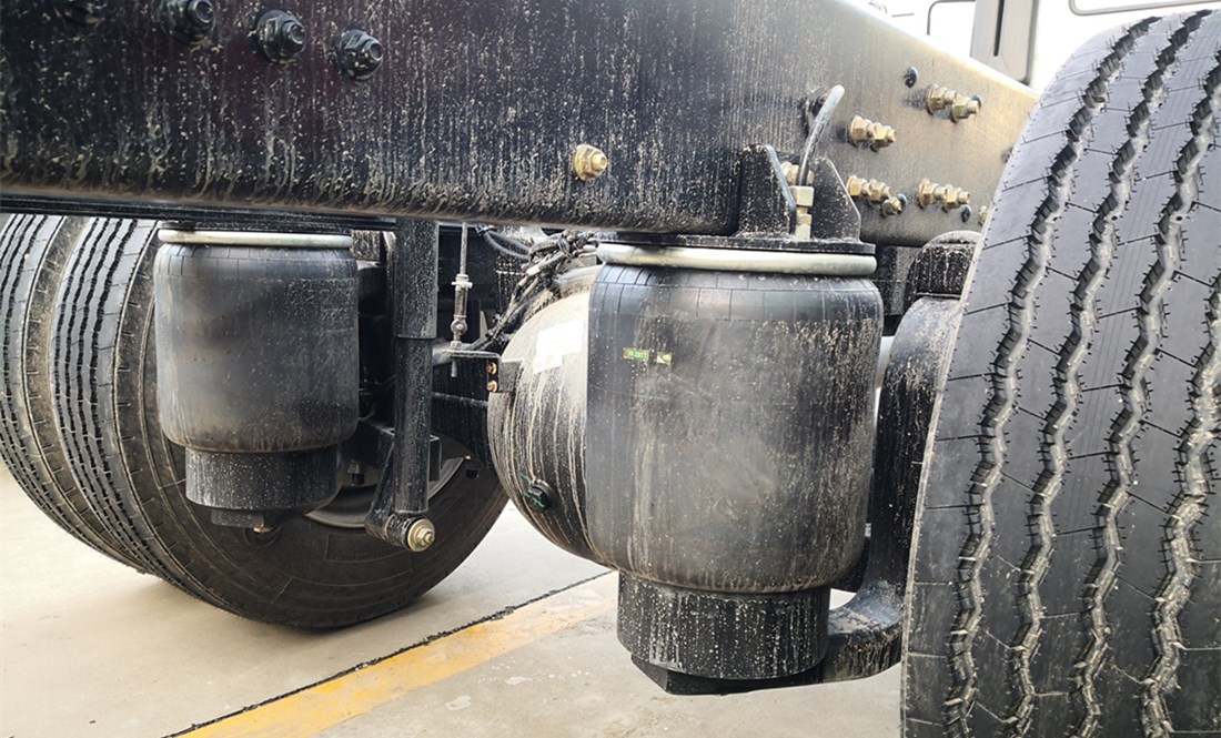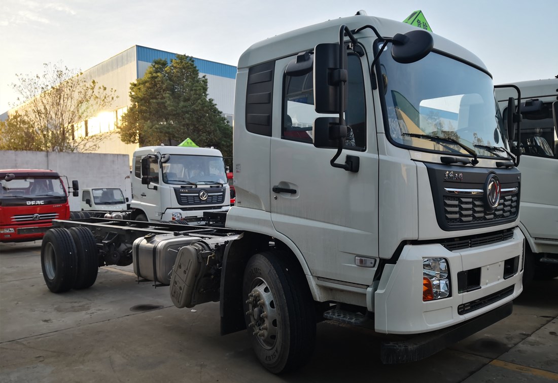 底盤配置:東風天錦KL駕駛室,陜齒八檔變速箱、前橋4.5噸、后橋10噸、250mm車架、帶空調、ABS、295真空胎、康明斯210馬力、前盤后鼓、排氣管前置、限速器(限速80KM/h)、ABS、排氣制動,后橋為空氣懸掛,前輪安裝防爆胎裝置、剎車蹄片磨損報警裝置。